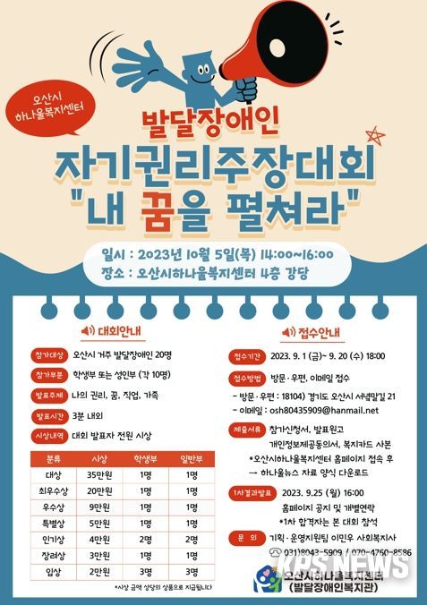 KPSNEWS 기자 | 오산시하나울복지센터(발달장애인복지관)는 9월 20일까지 3주간 발달장애인을 대상으로 ‘자기 권리 주장대회’ 참가자를 모집한다.
