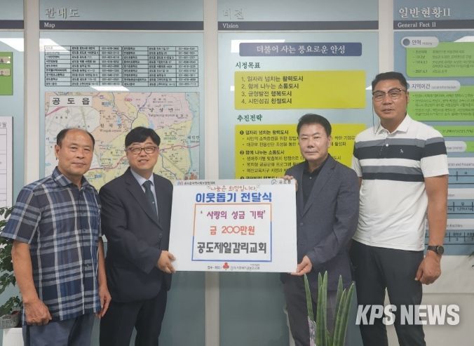 KPSNEWS 기자 | 안성공도제일감리교회는 지난 4일 창립 20주년을 맞아 성도들의 뜻을 모은 헌금 200만 원을 공도읍 지역사회보장협의체에 기탁했다.