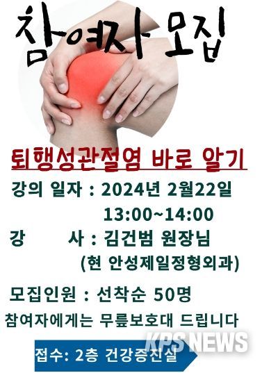 KPSNEWS 김채경 기자 | 안성시노인복지관은 ‘퇴행성 관절염’ 건강강좌 참여자를 모집한다고 8일 밝혔다.