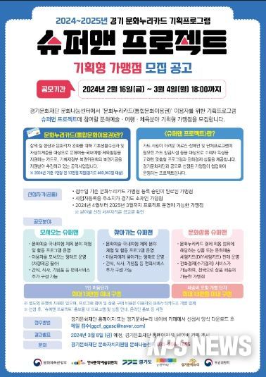 KPSNEWS 김채경 기자 | 경기문화재단 문화나눔센터가 2024-2025년 경기지역 문화누리카드 기획프로그램 '슈퍼맨 프로젝트'에 참여할 기획형 가맹점을 모집한다.
