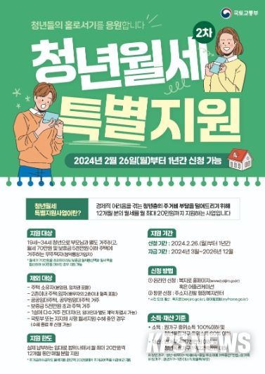 지원대상자는 19세부터 34세 청년 중 부모와 따로 거주하는 무주택 청년이다. 소득 및 재산조건은 청년가구 기준 중위소득 60%이하, 자산1억 2200만원 이하이며 부모님을 포함한 원가구 기준 중위소득 100%이하, 자산 4억 7000만원이하여야 신청 가능하다.