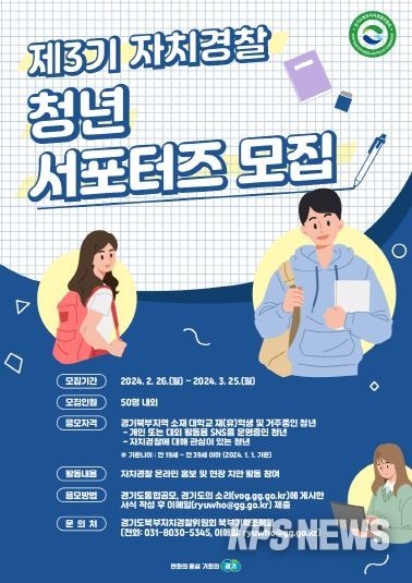 KPSNEWS 김채경 기자 | 경기도북부자치경찰위원회는 자치경찰에 대한 홍보와 치안캠페인 등 현장 활동을 할 ‘제3기 경기북부 자치경찰 청년 서포터즈’를 2월 26일부터 다음 달 25일까지 1달간 공개 모집한다.