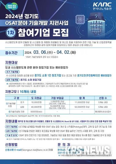 KPSNEWS 김채경 기자 | 경기도와 한국나노기술원이 시스템반도체 분야 창업기업을 대상으로 ‘2024년도 경기도 시스템반도체 후공정(OSAT) 분야 기술개발 지원사업’ 참여기업 1차 공모를 4월 2일까지 진행한다.