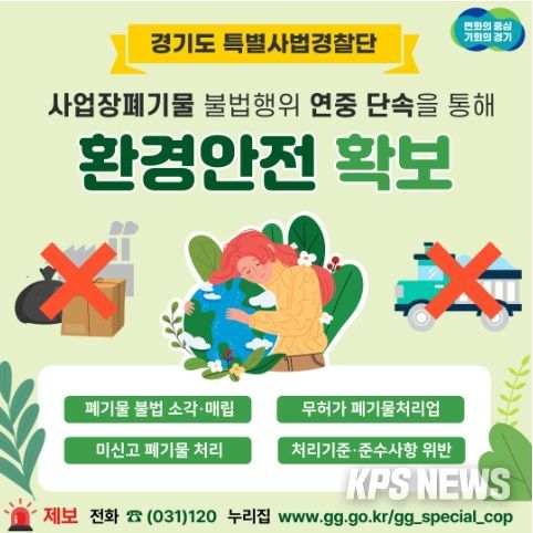 KPSNEWS 김채경 기자 | 경기도 특별사법경찰단이 사업장폐기물 불법행위 근절을 위해 배출 단계부터 수집·운반 및 최종 처리단계까지 적법하게 처리될 수 있도록 연말까지 전방위적 단속을 실시한다고 7일 밝혔다.