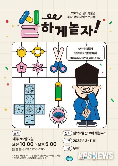 KPSNEWS 김채경 기자 | 경기문화재단 실학박물관(관장 김필국)은 3월 9일부터 주말 상설 체험프로그램 ‘실~하게 놀자!’ 운영을 시작했다. 본 프로그램은 남녀노소 가족이 함께 참여할 수 있는 다양한 만들기 활동을 통해 전시 유물과 실학자의 삶을 쉽고 재미있게 이해하는 체험이다. 지난해 3월 시작한 ‘실~하게 놀자!’는 연간 80회를 운영하며 15,000여 명이 참여한 박물관의 대표 인기 프로그램으로 자리매김했다. 관람객의 높은 만족도와 인기에 힘입어 올해도 신규프로그램과 함께 다시 한번 관람객을 맞이한다.