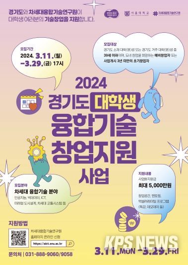 KPSNEWS 김채경 기자 | 경기도와 차세대융합기술연구원이 대학생들의 기술창업 활성화와 고도화를 위한 ‘대학생 융합기술 창업지원 사업’에 참여할 도내 대학생 예비(초기) 창업자를 29일까지 모집한다.