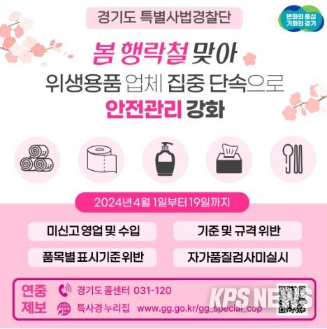 KPSNEWS 김채경 기자 | 경기도 특별사법경찰단이 4월 1일부터 19일까지 위생용품 제조·수입업체, 위생물수건처리업체를 대상으로 불법행위를 집중 단속한다.