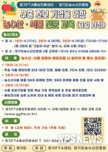 KPSNEWS 김채경 기자 | 경기농촌융복합산업지원센터가 경기FTA센터와 함께 농식품기업의 성공적인 해외수출을 위한 전문교육을 진행한다고 1일 밝혔다.
