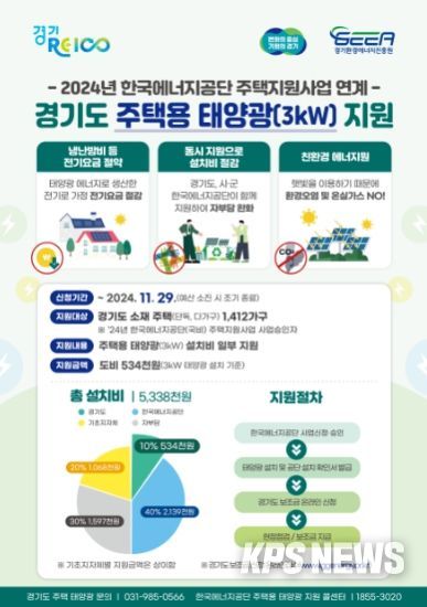 KPSNEWS 김채경 기자 | 경기도가 정부예산 삭감으로 줄어든 주택태양광 설치 지원사업에 도비 34억 원을 추가 투입한다. 국비 지원이 줄어들면서, 도 단독주택(다가구 포함) 태양광 설치 규모가 감소할 위기였지만 도의 지원으로 설치 규모가 작년보다 소폭 증가하게 됐다.
