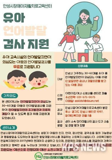 KPSNEWS 김채경 기자 | 성장기 만 18세 미만 아동의 전문적인 재활치료서비스를 제공하고 있는 안성시장애아재활치료교육센터에서는 안성시에 거주하는 30~60개월 유아 중 언어발달 지연이 의심되는 아동 25명을 대상으로 무료로 언어발달검사를 지원한다.