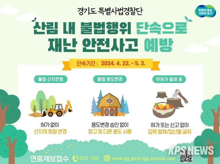 KPSNEWS 김채경 기자 | 경기도 특별사법경찰단은 4월 22일부터 5월 3일까지 도내 불법 산지전용 및 용도변경, 무허가 벌채 등 산림 내 불법행위를 집중 단속한다고 9일 밝혔다.