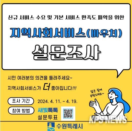 KPSNEWS 김채경 기자 | 수원시가 신규 지역사회서비스 수요와 기존 서비스의 만족도 등을 조사하는 ‘지역사회서비스 투자사업 설문조사’를 19일까지 진행한다.