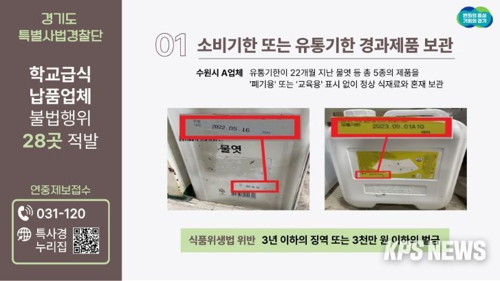 KPSNEWS 김채경 기자 | 경기도 특별사법경찰단이 개학을 맞아 지난 3월 11일부터 29일까지 학교급식 납품업체 360개소를 단속한 결과 유통기한이 22개월 지난 물엿 보관 등 관련법을 위반한 28곳(29건)을 적발했다고 16일 밝혔다.