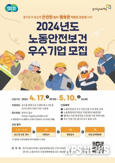 KPSNEWS 김채경 기자 | 경기도와 경기도일자리재단이 ‘2024년 경기도 노동 안전보건 우수기업 인증사업’에 참여할 모범 중소기업을 4월 17일부터 5월 10일까지 모집한다.