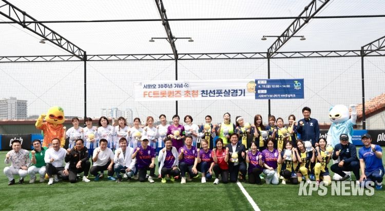 KPSNEWS 김채경 기자 | 시흥시가 시화호 30주년 기념행사의 일환으로 지역사회에 활력을 높이고자 19일 시화MTV 보니타가 옥상 풋살구장에서 FC트롯퀸즈를 초청한 친선 축구 경기를 진행했다.
