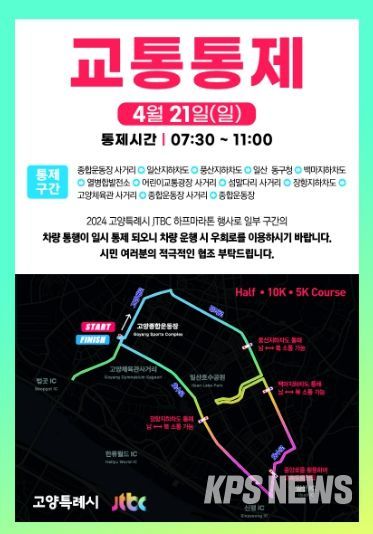 KPSNEWS 김채경 기자 | 고양특례시는 21일 2024 고양특례시-JTBC 하프 마라톤 대회 개최로 인해 고양시 주요 도로에서 교통통제가 이루어짐에 따라 시민들의 주의와 협조를 당부했다.