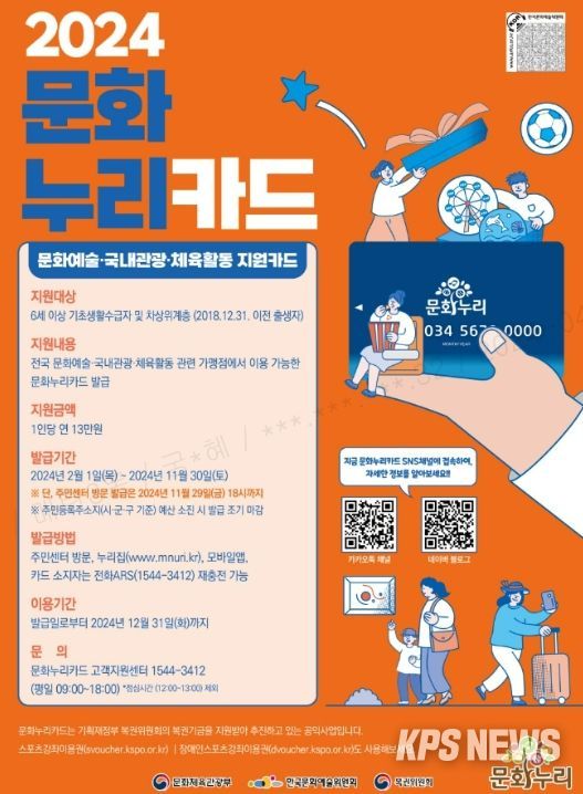 6세 이상 기초생활수급자 및 차상위계층이 신청할 수 있으며 발급기간은 2024년 11월 30일까지다. 신청자에게는 문화누리카드(바우처)가 발급되며 연간 13만원 사용이 가능하다.