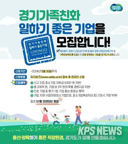 KPSNEWS 김채경 기자 | 경기도가 ‘경기가족친화 일하기 좋은 기업 인증사업 참여기업을 5월 20일까지 모집한다.