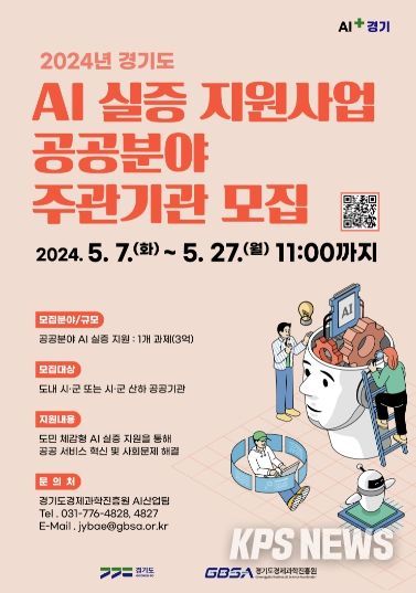 KPSNEWS 김채경 기자 | 경기도가 27일까지 '2024년 경기도 인공지능(AI) 실증 지원' 사업 공공분야 과제 참여 기관을 모집한다.