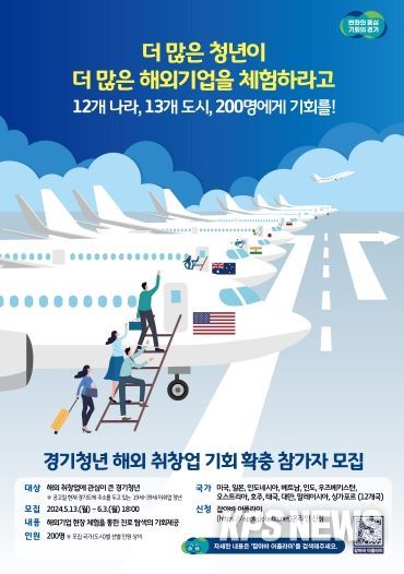 경기도와 경기도경제과학진흥원은 5월 13일부터 6월 3일까지 12개국 13개 도시에서 ‘경기청년 해외 취창업 기회 확충’ 사업에 참여할 경기도 청년 200명을 공개 모집한다.