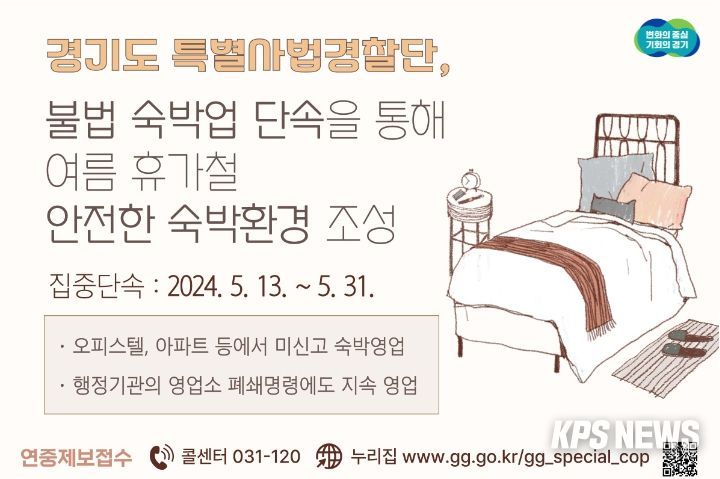 KPSNEWS 김채경 기자 | 경기도 특별사법경찰단이 5월 13일부터 31일까지 수원, 부천, 성남, 고양 등 도내 오피스텔 등이 밀집된 12개 지역을 대상으로 불법 숙박업을 집중 단속한다.