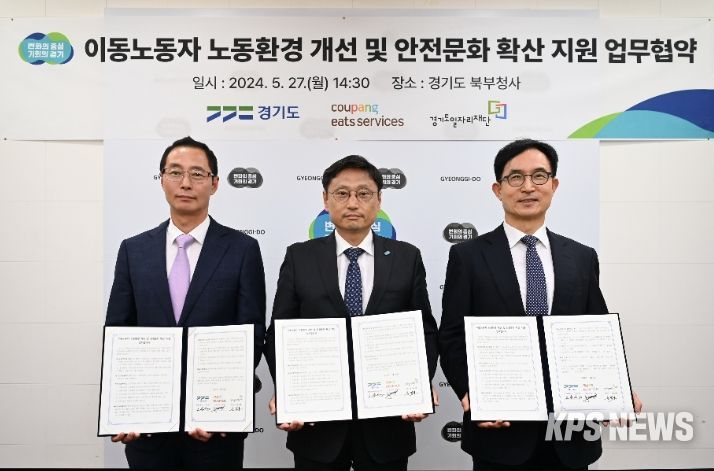 KPSNEWS 김채경 기자 | 경기도는 27일 경기도청 북부청사에서 경기도일자리재단과 온라인 음식 배달 서비스기업인 쿠팡이츠서비스와 함께 이동노동자 노동환경 개선과 안전 문화 확산을 위한 업무협약을 체결했다.