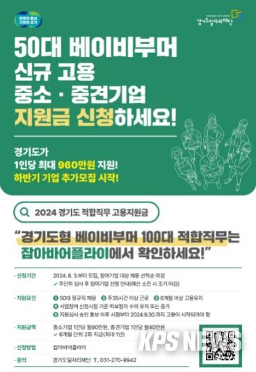 KPSNEWS 김채경 기자 | 경기도와 경기도일자리재단은 도내 중장년층 구직자를 위한 안정된 일자리 기회 제공과 중소기업의 인력난 해소를 위해 ‘경기도 적합직무 고용지원금’ 사업의 하반기 참여기업을 오는 9월 20일까지 선착순 모집한다.