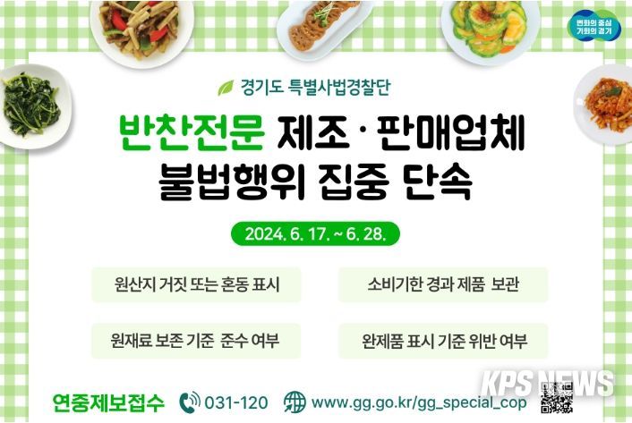 KPSNEWS 김채경 기자 | 경기도 특별사법경찰단은 17일부터 28일까지 도내 반찬전문 제조․판매업체 180곳을 대상으로 식품의 제조·판매과정에서의 불법행위를 집중 단속한다.