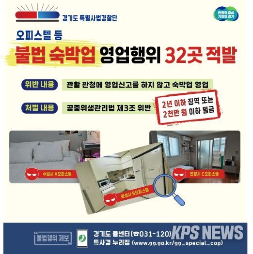 KPSNEWS 김채경 기자 | 숙박업 신고 없이 오피스텔, 주택, 아파트 등에서 영업을 한 불법 숙박업체 32곳이 경기도 특별사법경찰단 수사에 적발됐다.