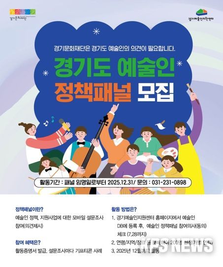정책 패널은 경기문화재단의 예술인 지원 사업·복지정책 등 필요한 당면과제에 의견을 제시하는 경기문화재단의 파트너로서 온라인 설문조사를 통해 의견을 제시한다. 경기문화재단에서는 사업설계 시, 예술인 정책 패널의 소중한 의견을 활용하고, 반영 결과를 공유함으로써 건강한 예술 생태계 문화를 만들어 가고자 한다. 정책 패널의 활동기간은 패널 임명일로부터 25년 12월까지다.
