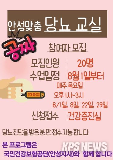 KPSNEWS 김채경 기자 | 안성시노인복지관은 국민건강보험공단 안성지사와 연계하여 “안성맞춤 당뇨교실” 프로그램 참여자를 모집한다고 25일 밝혔다.
