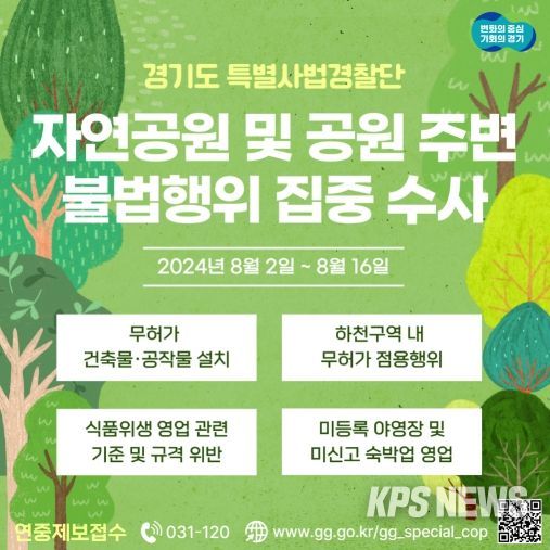 KPSNEWS 김채경 기자 | 경기도 특별사법경찰단이 2일부터 16일까지 자연공원과 공원 주변의 건축물, 하천구역 내 점용행위, 식품접객업소, 야영장, 숙박업소 대상으로 불법행위를 집중 수사한다.