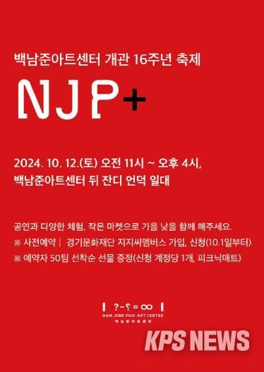 KPSNEWS 김채경 기자 | 경기문화재단 백남준아트센터는 2024년 10월 12일 개관 16주년 기념 축제 'NJP+'를 연다. 특히 이번 행사는 경기문화재단 기부브랜드인 문화이음의 포괄기부금 배분사업으로 선정 프로그램 중 하나이다. 아트센터는 제7회 머내마을영화제 공동체 상영관 참여, 가족휴게실 신규 조성에 이어 개관 16주년 기념 행사를 포괄기부금을 활용 추진하고 있다.