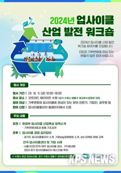 KPSNEWS 김채경 기자 | 경기도-경기환경에너지진흥원-호반프라퍼티는 오는 11일부터 12일까지 수원 호반프라퍼티 아브뉴프랑 광교점에서 ‘2024 업사이클빌리지 페스티벌 및 산업발전 워크숍’을 개최한다.