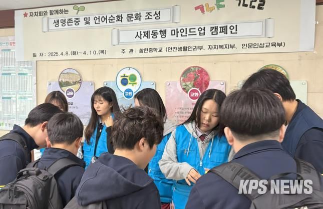 KPSNEWS 김채경 기자 | 함현중학교는 학생자치회와 함께 지난 8일(화)부터 3일간 ‘생명 존중, ‘언어 순화’, ‘사제동행’을 주제로 연속 캠페인을 진행했다. 이번 캠페인은 학생 자치 문화의 활성화와 더불어 학생들의 생명 존중 의식 함양, 언어 사용 개선, 그리고 교사-학생 간의 유대 강화라는 의미 있는 목표를 담고 있다.