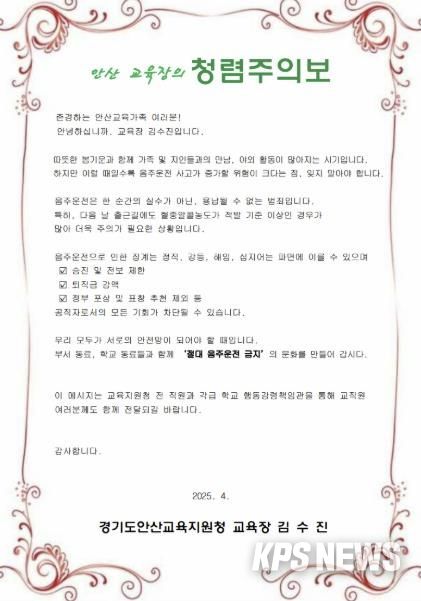 김수진 교육장은 ‘청렴 주의보’ 메시지를 통해 “따뜻한 봄기운과 함께 야외활동이 많아지는 시기일수록 음주운전 사고의 위험이 높아진다”고 강조하며, “음주운전은 단순한 실수가 아닌 공직자의 모든 기회가 박탈될 수 있는 범죄”라고 경고했다.