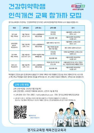 KPSNEWS 김채경 기자 | 경기도교육청이 17일부터 ‘건강 취약 학생’에 대한 인식개선과 통합적 지원 강화를 위한 맞춤형 교육을 총 4회에 걸쳐 실시한다.