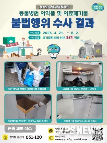 기이도 경기도 특별사법경찰단장은 “의료폐기물 관리 소홀로 도민의 안전이 위협받지 않고, 안심할 수 있는 반려동물 의료환경을 만들기 위해 앞으로도 동물병원 의료폐기물 불법행위를 지속적으로 수사하겠다”며 “동물병원의 의료폐기물 관리에 대한 인식이 개선될 수 있도록 상시 예방 활동에도 최선을 다하겠다”고 말했다.
