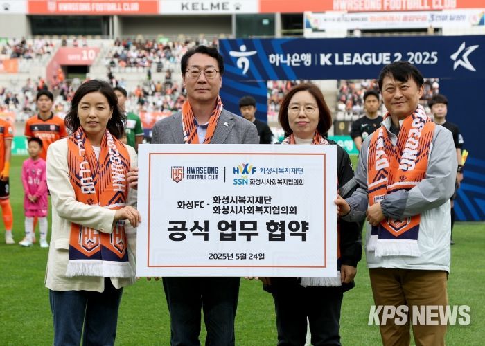 KPSNEWS 김채경 기자 | 화성FC(구단주 정명근)는 24일 화성종합경기타운 주경기장에서 열린 서울 이랜드 FC와의 홈경기에서 화성시복지재단, 화성시사회복지협의회와 함께 사회공헌 활동을 위한 3자 협약을 체결했다.