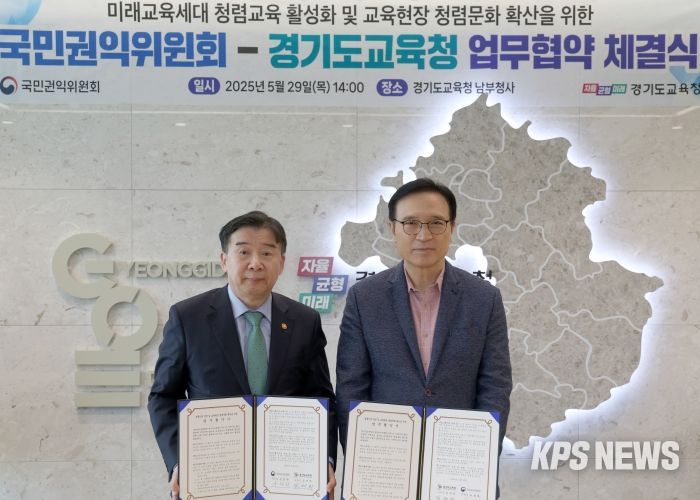 경기도교육청과 국민권익위원회는 29일 남부청사에서 미래세대의 청렴 의식 제고와 교육 현장 전반의 문화 확산을 위한 업무협약(MOU)을 체결했다.