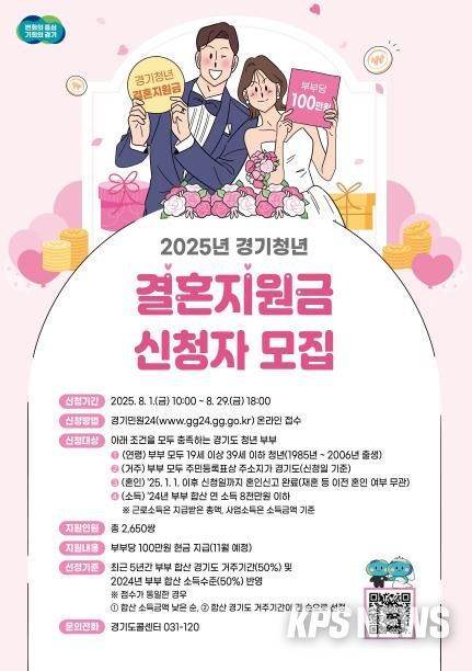 KPSNEWS 김채경 기자 | 경기도는 청년 신혼부부의 경제적 부담을 덜고 생활 안정을 지원하기 위해 총 2,650쌍의 부부에게 현금 100만 원을 지급하는 ‘경기청년 결혼지원사업’을 추진한다.