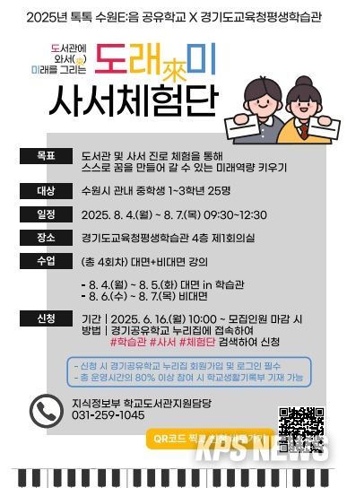 KPSNEWS 김채경 기자 | 경기도교육청평생학습관이 수원시 중학생을 대상으로 ‘도래(來)미 사서체험단’을 운영한다.