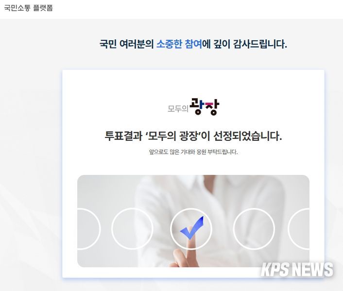 KPSNEWS 김채경 기자 | 대통령 직속 국정기획위원회(위원장 이한주)는 국민의 목소리를 국정에 반영하기 위해 지난 6월 18일부터 운영 중인 온라인 국민소통 플랫폼(가칭'이재명 대통령에게 바란다')의 정식 명칭이 ‘모두의 광장’으로 확정됐다고 25일 밝혔다.