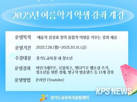 KPSNEWS 김채경 기자 | 경기도교육복지종합센터가 도내 청소년을 대상으로 녩여름학기 유튜브 학생강좌’를 실시한다.