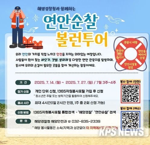 KPSNEWS 김채경 기자 | 해양경찰청은 다가오는 여름 휴가철을 맞아 7월 중 인천과 여수시 주요 관광지에서 국민들이 직접 연안안전 활동에 참여하고 해양안전 수칙을 되새기는 특별 자원봉사 프로그램 ‘연안순찰 봉사여행’을 운영한다고 4일 밝혔다.