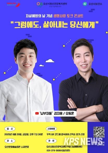 KPSNEWS 김채경 기자 | 오산시정신건강복지센터 부설 자살예방센터는 오는 8월 29일 오후 7시 30분, 오산문화예술회관 소공연장에서 ‘세계 자살예방의 날’을 기념해 생명존중 문화를 확산하고 자살 예방의 중요성을 알리기 위한 ‘생명사랑 토크 콘서트’를 개최한다고 밝혔다.