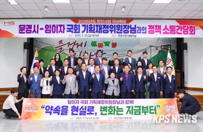 KPSNEWS 김채경 기자 | 문경시는 지난 7월 25일 시청 대회의실에서 임이자 국회 기획재정위원장과 함께 신현국 문경시장, 이정걸 문경시의회 의장, 시·도의원, 국소장 및 실단과소장 등 80여 명이 참석해 민선8기 핵심 현안사업 점검 및 2026년도 국·도비 확보 전략 마련을 위한 정책소통 간담회를 개최했다.