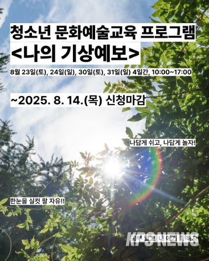 이번 프로그램의 큰 주제는 ‘나의 기상예보’로, 청소년들이 감정과 생각을 창의적인 방식으로 표현할 수 있도록 구성됐다. 8월 23일부터 31일까지 매주 주말(토, 일), 총 4일간 수원시 권선구에 위치한 경기상상캠퍼스에서 진행된다.