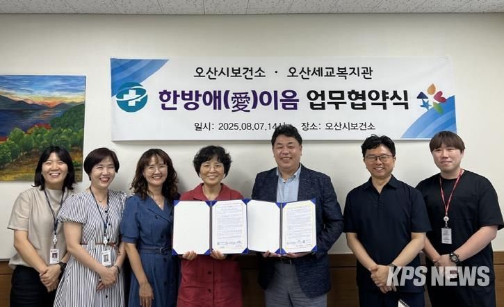 KPSNEWS 김채경 기자 | 오산시 보건소는 지난 8월 7일 오산세교종합사회복지관과 함께 건강 취약계층의 건강 사각지대 해소를 위한 ‘한방애(愛) 이음’ 협력사업 추진을 위한 업무협약을 체결했다고 밝혔다.