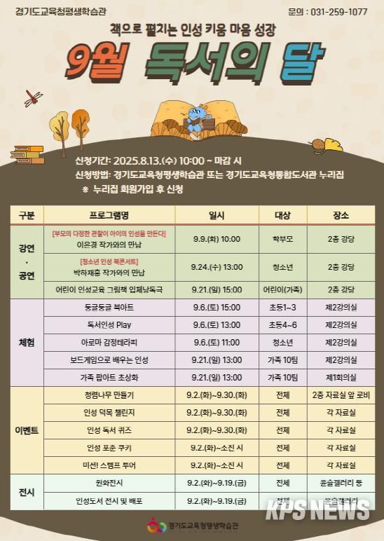 KPSNEWS 김채경 기자 | 경기도교육청평생학습관이 ‘책으로 펼치는 인성 키움 마음 성장’을 주제로 䃹월 독서의 달’행사를 운영한다.
